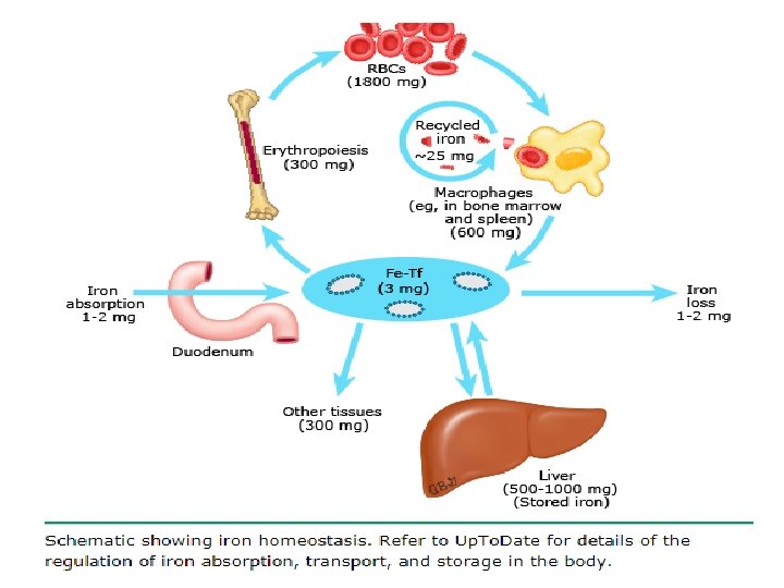 Demir Metabolizması Ø Gıda ile alınan demirin %10 -15 kadarı duedonum ve proksimal jejenumdan emilir. Günlük ihtiyaç: Ø Erkek ve postmenapoz kadın 1 mg, Ø Mens çağı ve emziren kadın 2 mg Ø Gebelerde 3 -4 mg. Ø Vücut toplam demiri erkeklerde 50 mg/kg; kadınlarda 40 mg/kg