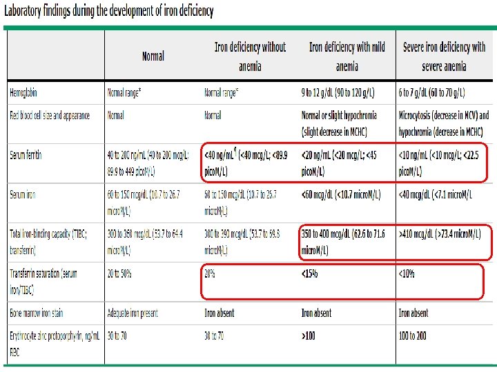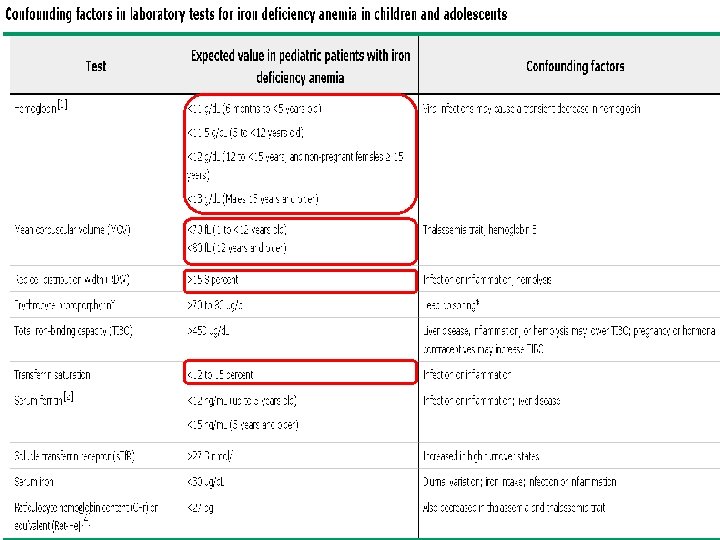 Ferritin � Ferritin sağlıklı yetişkinlerde demir depolarının çok iyi bir göstergesidir ve demir eksikliğinin tanısında altın standart olan kemik iliği demir boyasının yerini almıştır. � Anemisi olan yetişkinlerde kemik iliği demir boyası (altın standart) ile diğer demir parametrelerini karşılaştıran sistematik derlemede, serum ferritini demir eksikliği için en yüksek prediktif değere sahip bulunmuştur. Laboratory diagnosis of iron-deficiency anemia: an overview.