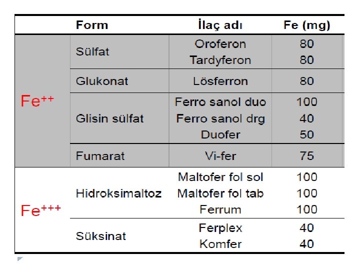Tedavi Oral demir kullanımı: � Aç olarak veya � Yemekten � Başka 1, 5 -2 saat sonra ilaçlarla arasında en az 2 saat olacak şekilde verilmeli