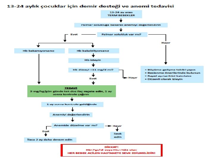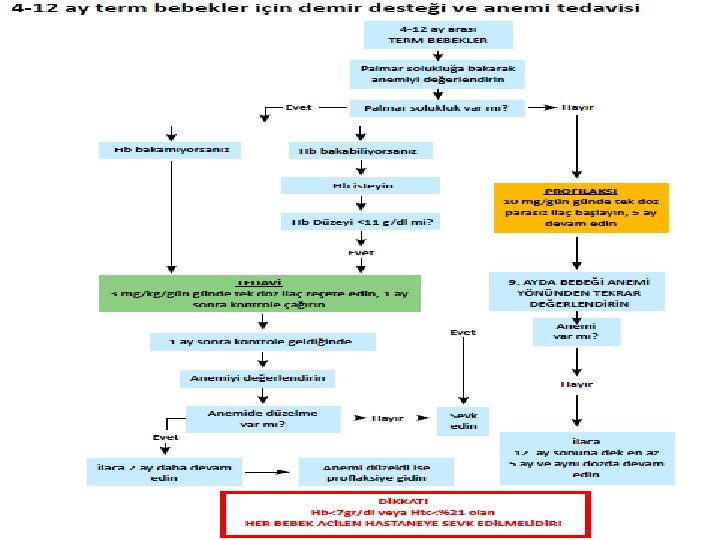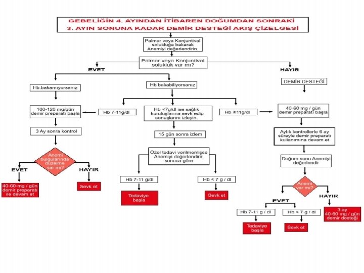 Gebelik 2) Orta şiddette anemi : � Hemoglobin 7 -11 g/dl ve/veya avuç içi veya konjonktivada solukluk � Orta şiddette aneminin tedavisinde gebelerde günde 100 -120 mg elementer demir kullanılır. � 1 ay sonra hemoglobin izleminde en az 1 g/dl’lik artış yok ise bir üst merkeze sevk edilmeli!!!