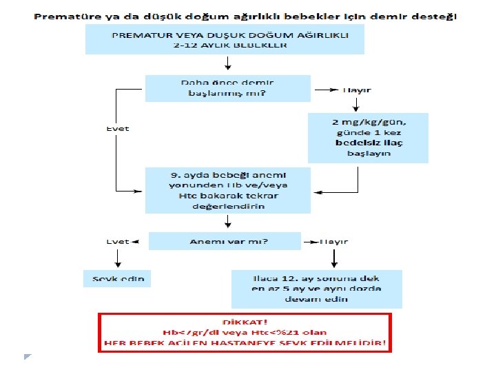 Gebelik 1) Klinik anemi yok: � Hemoglobin � Tüm >11 g/dl, solukluk yok gebelere ikinci trimestirden başlayarak 6 ay � Doğum sonu 3 ay olmak üzere � Toplam 9 ay süre ile destek 40 -60 mg / gün elementer demir verilir.