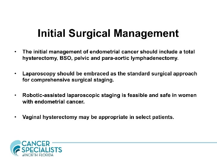 Best Practices • Gynecologic oncologists should be involved in the initial care of every woman diagnosed with endometrial cancer.