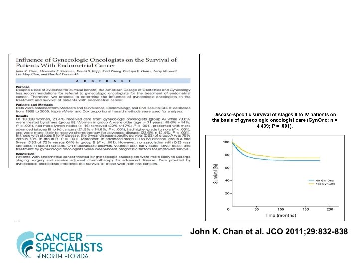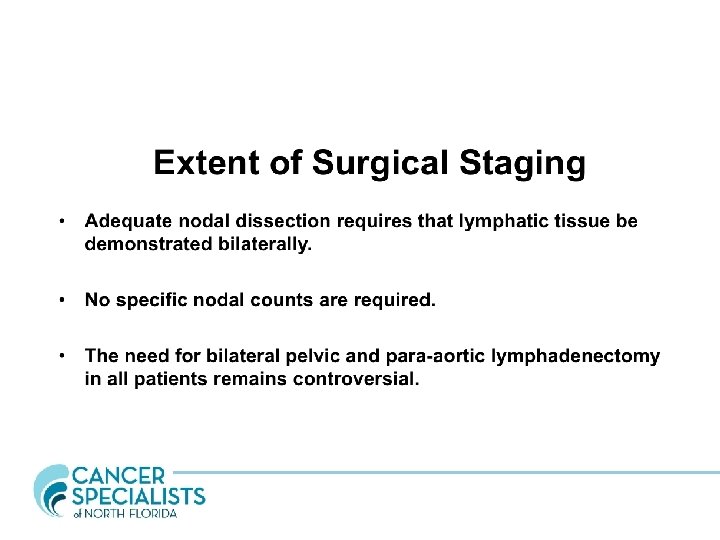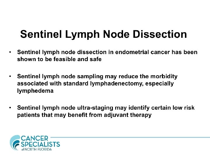 What is “Adequate” Staging? • Ability to assess full extent of disease – Chan JK et al. , “Lymphadnectomy in endometrioid uterine cancer staging: how many lymph nodes are enough? A study of 11, 443 patients. ” Cancer 2007 109(12): 2454 -60 • Increasing number of lymph nodes removed associated with higher likelihood of identifying those with lymph node metastases • Largest increase in probability of detection was when 21 -25 lymph nodes were removed. >25 lymph nodes did not significantly improve detection rate