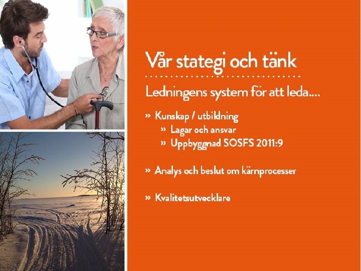 e. Hälsa- ledning och styrning Ledning och styrning Exempel: § Digitaliserade ledningssystem som stödjer ett systematiskt förbättringsarbete Framtiden - kunna kommunicera/hämta data för egenkontroll och evidensbaserat arbetssätt Anna-Greta Brodin E-hälsostrateg Kärnverksamhet God hälsa brukare/patient