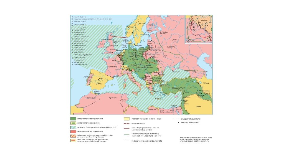 Krigen i hovedtrekk • Foregikk hovedsakelig på europeisk kontinent • Bevegelig i øst, stillingskrig i vest (skyttergraver) • USA fra 1917: Flere vellykkede offensiver sommeren og høsten 1918 • 11. November 1918 våpenstillstandsavtale • 1919 – Versaillestraktaten