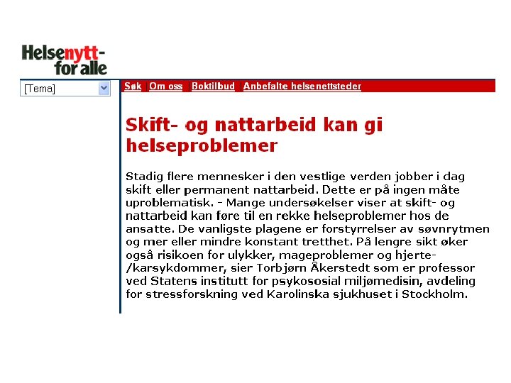 Andre helseeffekter • Morikawa et al: mer diabetes i roterende skift enn hos dagarbeidere • Nagaya et al (2002): Markører for insulinsresistens: Mindre gunstige funn hos yngre skiftarbeidere enn yngre dagarbeidere • Karlsson et al (2003): Lavere nivå av det sunne fettet og høyere nivå av det usunne fettet hos skiftarbeidere