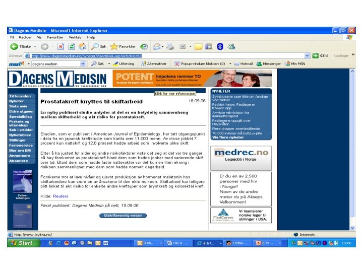Schernhammer et al. (2003) • • 80000 sykepleiere spørreskjema fulgt i 10 år 36% økt risiko for brystkreft hos dem som hadde hatt mer enn 30 år med skiftarbeid med roterende skift • langt mindre hos dem med mindre enn 30 år skiftarbeid