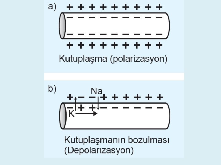 Sonuçta; • Sinir hücresi dendrit’den uyarı alır. • Bu uyarı ile dinlenme potansiyelini polarizasyon ile koruyan nöron, • Dendritten akson’a doğru depolarizasyon’a uğrar. • Depolarizasyon’u arkadan repolarizasyon takip eder. • Repolarizasyon’un sonunda dinlenme potansiyeline tekrar ulaşılır. • Nöron yeni uyarıcılar için hazır durumdadır.