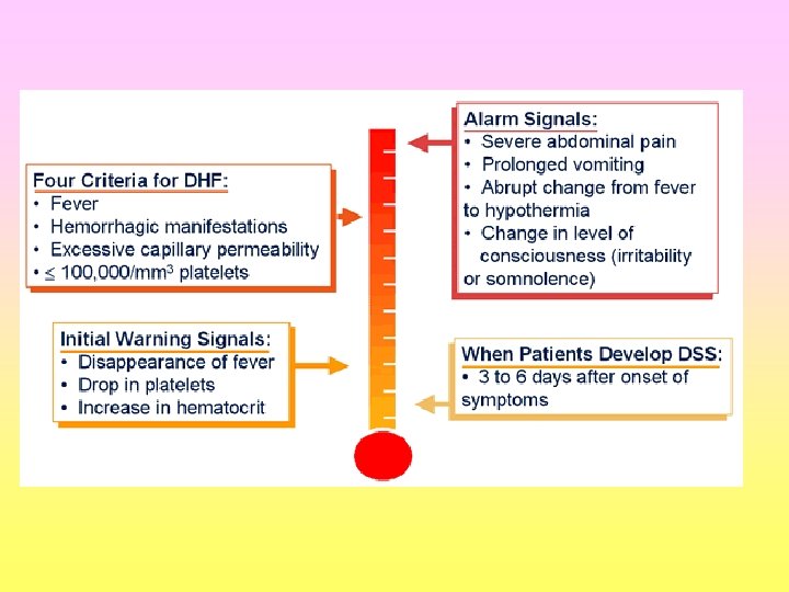 This thermometer illustrates the developments in the illness that are progressive warning signs that DSS may occur. The initial evaluation is made by determining how many days have passed since the onset of symptoms. Most patients who develop DSS do so 3 -6 days after onset of symptoms. Therefore, if a patient is seven days into the illness, it is likely that the worst is over. If the fever goes between three and six days after the symptoms began, this is a warning signal that the patient must be closely observed, as shock often occurs at or around the disappearance of fever. Other early warning signs to be alert for include a drop in platelets, an increase in hematocrit, or other signs of plasma leakage. If you document hemoconcentration and thrombocytopenia and other signs of DHF and the patient meets the criteria for DHF, the prognosis and the patient's risk category have changed. Though dengue fever does not often cause fatalities, a greater proportion of DHF cases are fatal. The next concern would be observation of the danger signs—severe abdominal pain, change in mental status, vomiting and abrupt change from fever to hypothermia. These often herald the onset of DSS. The goal of treatment is to prevent shock. The plasma leakage syndrome is self-limited. If you can support the patient through the plasma leakage phase and provide sufficient fluids to prevent shock, the illness will resolve itself.