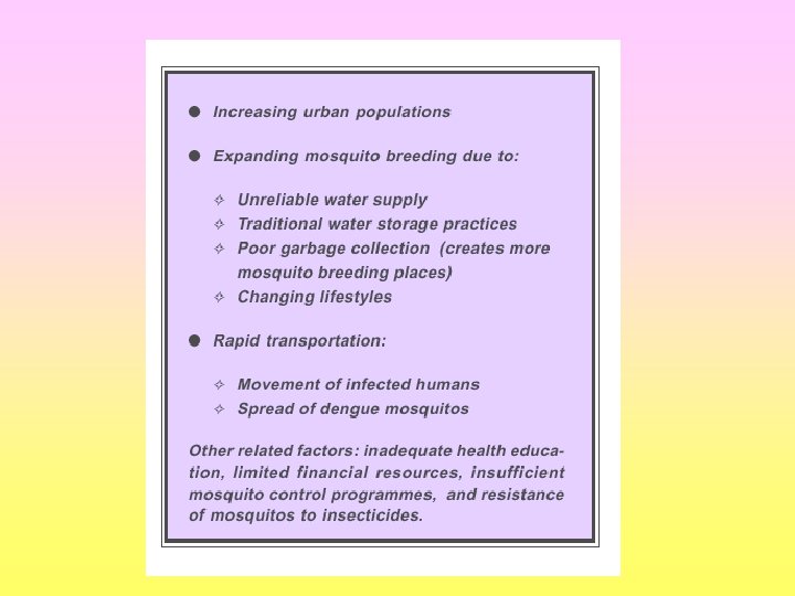 Epidemiology • In India first outbreak of dengue was recorded in 1812 • A double peak hemorrhagic fever epidemic occurred in India for the first time in Calcutta between July 1963 & March 1964 • In New Delhi, outbreaks of dengue fever reported in 1967, 1970, 1982, &1996