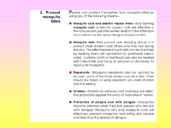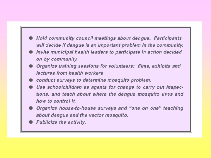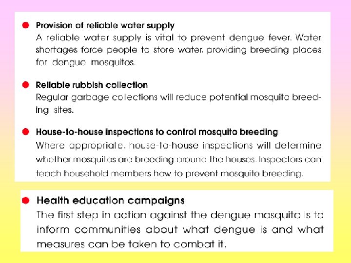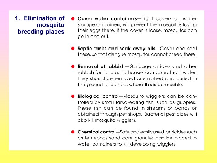 Purpose of Control • Reduce female vector density to a level below which epidemic vector transmission will not occur • Based on the assumption that eliminating or reducing the number of larval habitats in the domestic environment will control the vector • The minimum vector density to prevent epidemic transmission