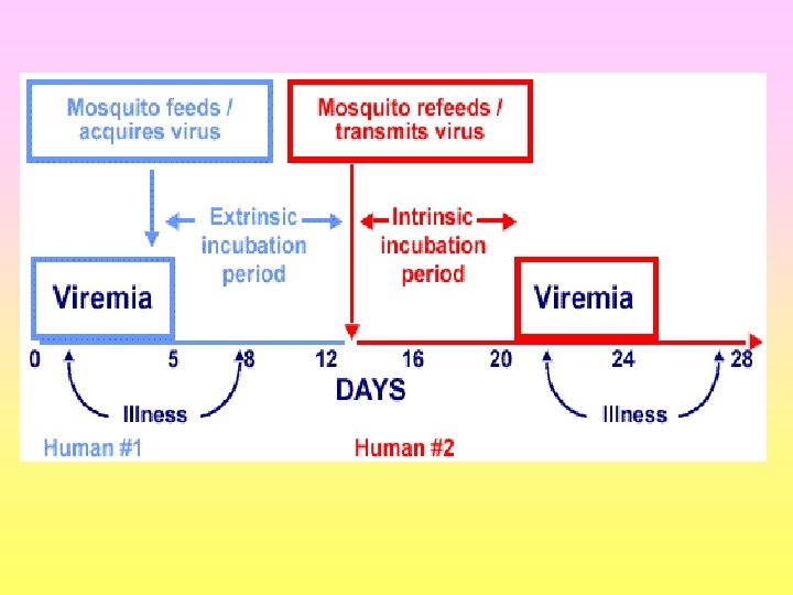 The transmission cycle of dengue virus by the mosquito Aedes aegypti begins with a dengue-infected person. This person will have virus circulating in the blood —a viremia that lasts for about five days. During the viremic period, an uninfected female Aedes aegypti mosquito bites the person and ingests blood that contains dengue virus. Although there is some evidence of transovarial transmission of dengue virus in Aedes aegypti, usually mosquitoes are only infected by biting a viremic person. Then, within the mosquito, the virus replicates during an extrinsic incubation period of eight to twelve days. The mosquito then bites a susceptible person and transmits the virus to him or her, as well as to every other susceptible person the mosquito bites for the rest of its lifetime. The virus then replicates in the second person and produces symptoms. The symptoms begin to appear an average of four to seven days after the mosquito bite—this is the intrinsic incubation period, within humans. While the intrinsic incubation period averages from four to seven days, it can range from three to 14 days. The viremia begins slightly before the onset of symptoms. Symptoms caused by dengue infection may last three to 10 days, with an average of five days, after the onset of symptoms—so the illness persists several days after the viremia has ended.