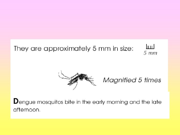 Aedes aegypti • Dengue transmitted by infected female mosquito • Primarily a daytime feeder • Lives around human habitation • Lays eggs and produces larvae preferentially in artificial containers