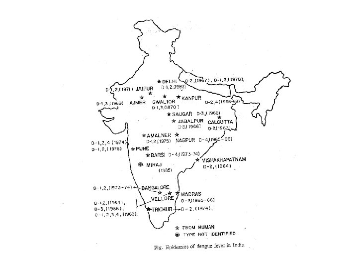 Dengue in India § First isolated in Calcutta in 1945 § Extensive epidemics since 1963 § DHF, DSS epidemics over last 4 decades § Severe epidemic in Delhi in 1996, 2006; Lucknow 1998, 2003, 2006 § All 4 serotypes are prevalent § Viruses prevalent all over except Himalayan region & Kashmir