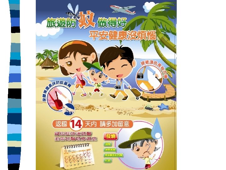 Route of transmission n This is a day-biting species日間叮人 with increased biting activities for 2 hours after sunrise and several hours before sunset. n Patients are usually infective for mosquitoes from shortly before to the end of the febrile period 剛發燒前至退燒期 , an average of about 6 -7 days. It cannot be directly transmitted from person to person.