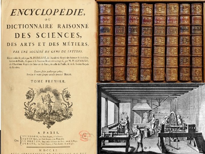 L’Encyclopédie � L’Encyclopédie, le simbole du siècle des lumières, était un projet de traduction de la Cyclopoedia de Chambers, donné à Diderot. � Diderot et D’Alembert dirigent le projet qui recueille articles générales. � Des personnalités des monde scientifique et littéraire ( Voltaire, Rousseau, Marmontel…) ont collaboré dans ce project.