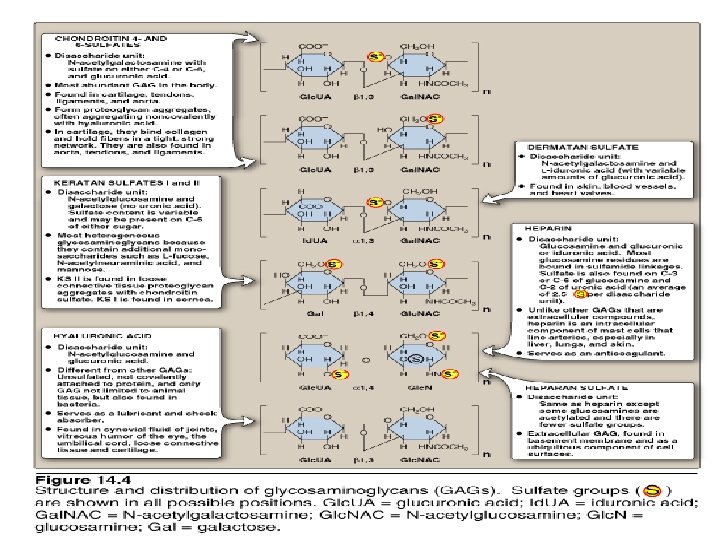 Differences between glycoproteins and proteoglycans Glycoproteins Proteoglycans Proteins conjugated to saccharides lacking a serial repeat unit Protein>>carbohydrate Proteins conjugated to polysaccharides with serial repeat units Carbohydrate>>protein Glycosaminoglycans Mucopolysaccharides Repeat unit Hex. N and Hex. UA