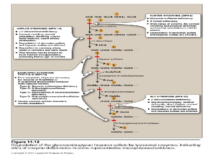 MUCOPOLYSACCHARIDOSES (MPS) Rare inborn errors in the degradation of glycosaminoglycans result in a series of diseases called mucopolysaccharidoses; characterized by mental retardation and/or structural defects. MPS Type I Hurler’s syndrome results from a deficiency of alpha-L-iduronidase. Heparan sulfate and dermatan sulfate accumulate. There is growth and mental retardation with characteristic facial changes. MPS Type II Hunters syndrome is similar to Hurler’s syndrome but the enzyme deficiency is for iduronate sulfatase and the inheritance is X-linked. MPS Type III Sanfilipo’s syndrome is caused by a deficiency of one of four enzymes of which three are hydrolases and one is an Nacetyltransferase. There is severe mental retardation but only mild structural features. Other MPS Types are IV, VI and VII. There is no MPS Type V.