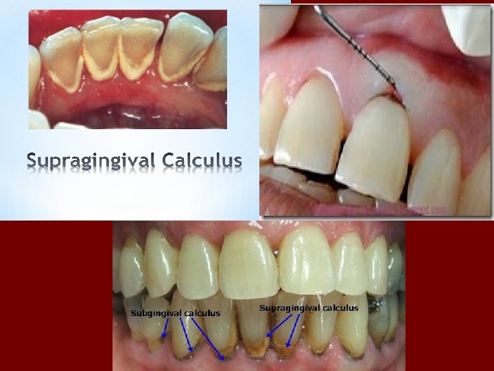 Clinical appearance and distribution of calculus Supragingival calculus is whitish- yellowish deposit, usually present along the gingival margins of the teeth. However, the color of which may be changed to brown due to secondary staining from tobacco and food pigments.