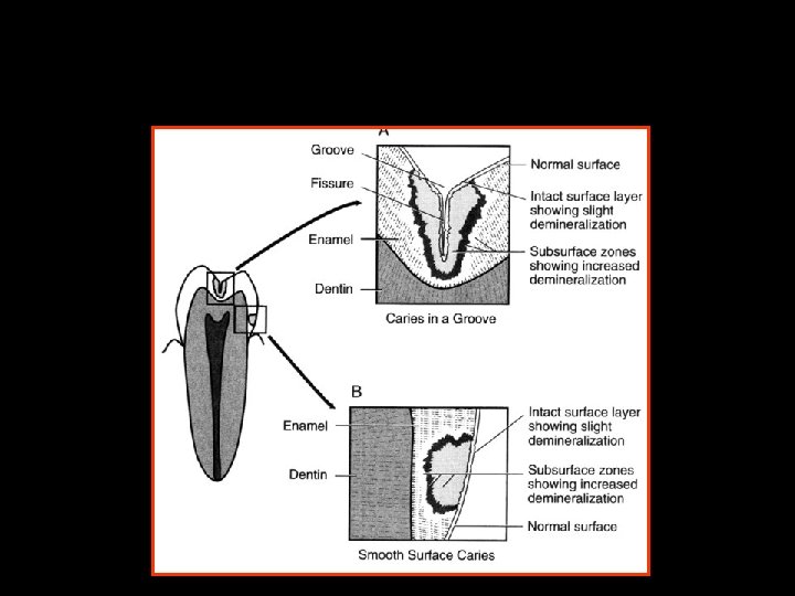 • CARIES OF ENAMEL Smooth surface Caries: • Due to plaque formation on enamel. The earliest manifestation of incipient caries (early caries) of enamel is usually seen beneath dental plaque as areas of decalcification (white spots).