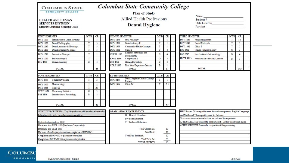 Admissions Criteria • Completed application and acceptance to Columbus State Community College. Some admissions testing may be required for admission to CSCC. • High School graduate or GED • GPA 2. 95 minimum • Placement into STAT 1350 Elementary Statistics • Placement into ENGL 1100 Freshman Composition • Placement out of reading requirements or completion of DEV 0145 • Completion of BIO 0100 or placement equivalent • Completion of CHEM 0100 or placement equivalent