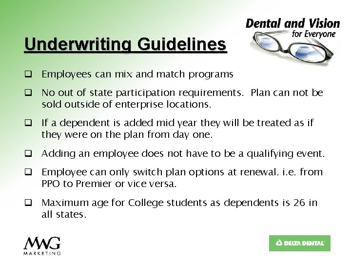 Dental for Everyone History (cont. ) q The first available effective date for the 16 state enterprise rollout was February 1, 2007. In 1 1/2 years MWG has tripled the total block of business that it took almost 4 years to build. q The success achieved in the first year can be attributed to the implementation of an online enrollment system created by MWG, the addition of the PPO option, the plan being available in more states, and internet marketing.