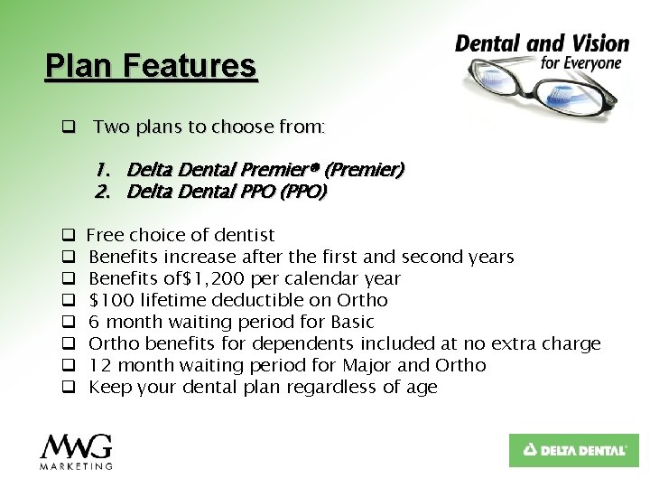 Plan Features q Two plans to choose from: 1. Delta Dental Premier® (Premier) 2. Delta Dental PPO (PPO) q q q q Free choice of dentist Benefits increase after the first and second years Benefits of$1, 200 per calendar year $100 lifetime deductible on Ortho 6 month waiting period for Basic Ortho benefits for dependents included at no extra charge 12 month waiting period for Major and Ortho Keep your dental plan regardless of age