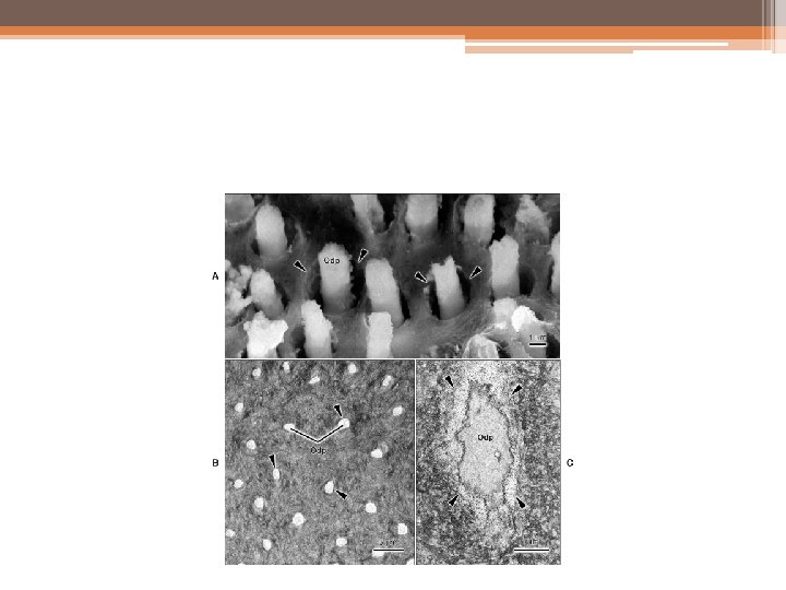• Some of them enter adjacent or distant tubules while others end in the intertubular dentin. A few odontoblastic processes extend through the DEJ into the enamel for several millimeters. These are termed enamel spindles