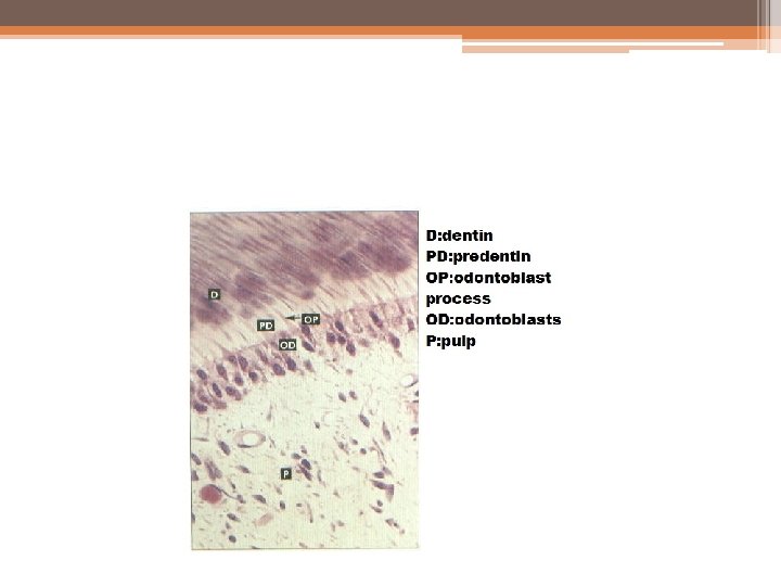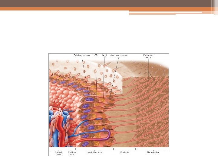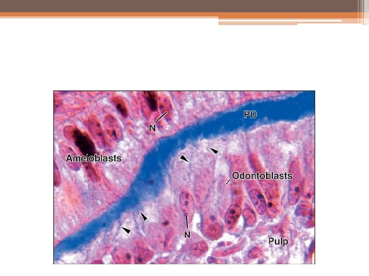 Predentin: • The predentin is located always adjacent to the pulp tissue and is 2 to 6 m wide, depending on the extent of activity of the odontoblast. It is not mineralized. The predentin appears to be pale staining than the mineral- ized dentin owing to differences in composition of the matrix. As the collagen fibers undergo mineralization at the predentin- dentin junction, the predentin becomes dentin and a new layer of predentin forms circumpulpally.