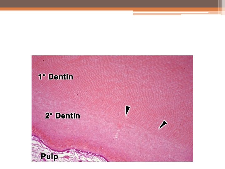 • SECONDARY DENTIN • Secondary dentin is a narrow band of dentin bordering the pulp and representing that dentin formed after root completion. This dentin contains fewer tubules than primary dentin. secondary dentin is formed more slowly than primary dentin and that it looks similar to primary dentin but contains fewer tubules.