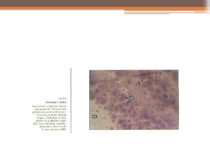 INTERGLOBULAR DENTIN • Sometimes mineralization of dentin begins in small globular areas that fail to coalesce into a homogenous mass. This results in zones of hypomineralization between the globules. These zones are known as globular dentin or interglobular spaces.