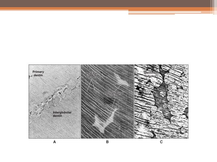 • This dentin forms in the crowns of teeth in the circumpulpal dentin just below the mantle dentin, and it follows the incremental pattern. The dentinal tubules pass uninterruptedly through interglobular dentin, thus demonstrating defect of mineralization and not of matrix formation