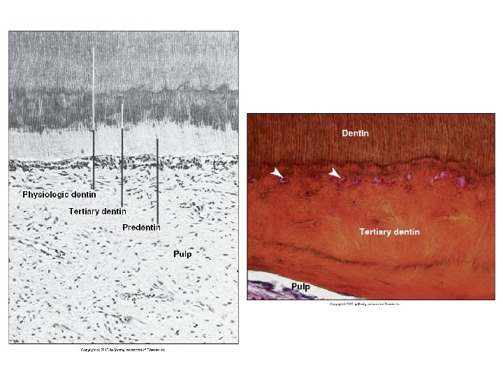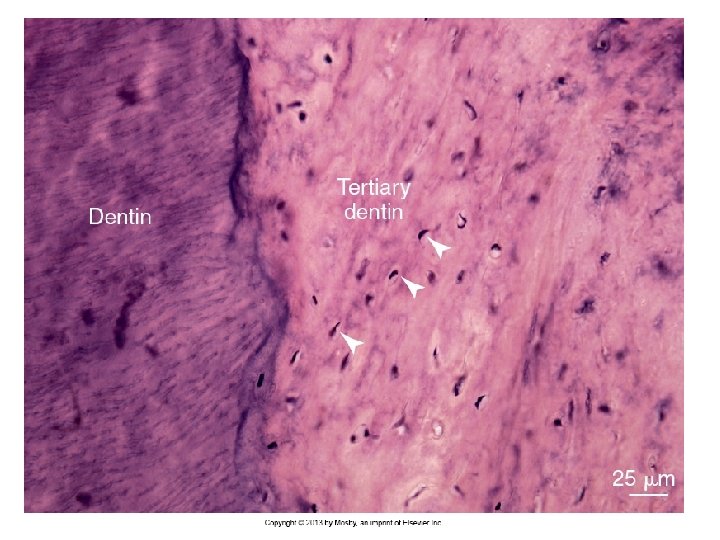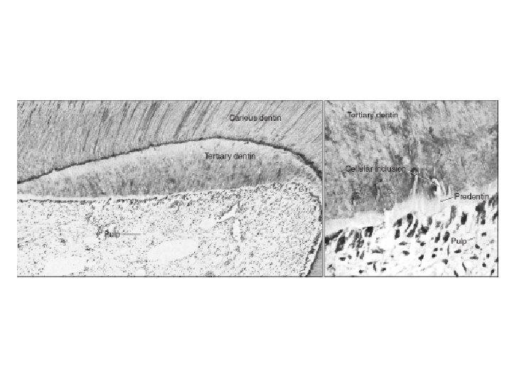 Tertiary Dentin Rate of deposition depends on the degree of injury More severe injury: more rapid rate of dentin deposition Due to rapid rate of deposition cells get entrapped in the newly formed matrix and tubular pattern becomes grossly distorted Essentials of Oral Histology and Embryology, Ed: James Avery, 3 rd edition.