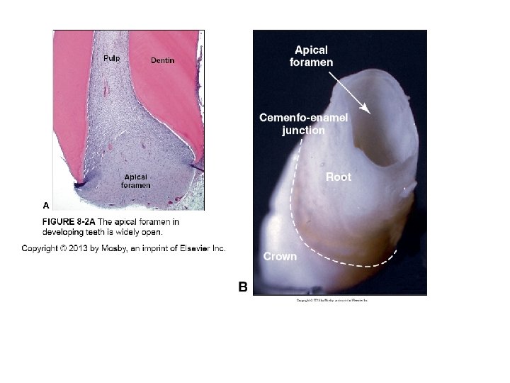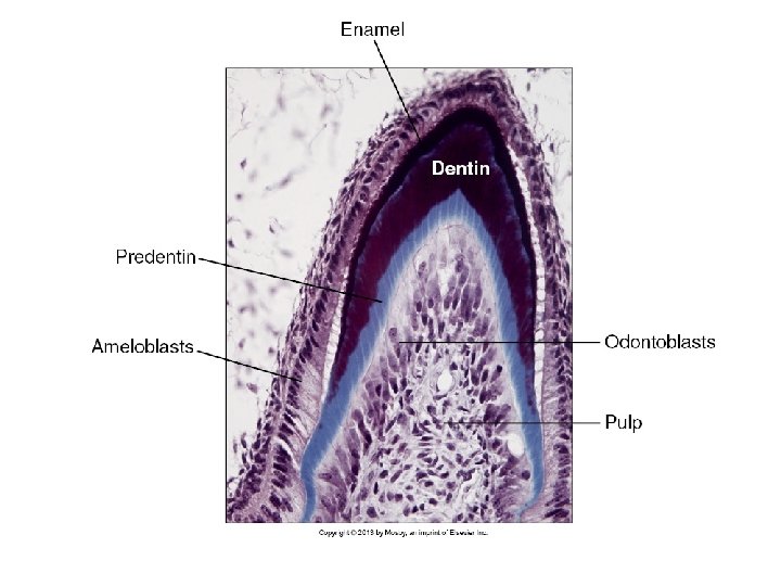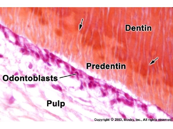 Dentin formation • • Begins at bell stage From cusp tips and down the slope Coronal and radicular dentin Completion of root dentin occurs after tooth eruption (open apex) • Completion of root dentin formation does not occur in the primary tooth until 18 months after eruption; and 2 -3 years for permanent teeth after eruption (during this period the tooth is said to have an open apex)