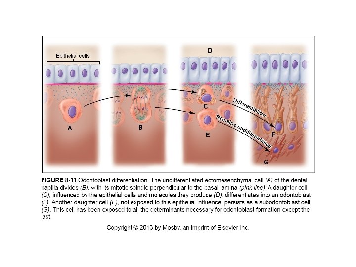 Dentinogenesis • • Odontoblasts (preodontoblasts) Role of inner enamel epithelium Acellular zone (collagen fibrils) First product: type III collagen fibrils with fibronectin (von Korff’s fibers) • Then type I collagen parallel to DE junction • Enamel spindles • Odontoblastic processes