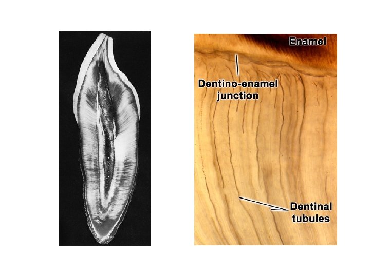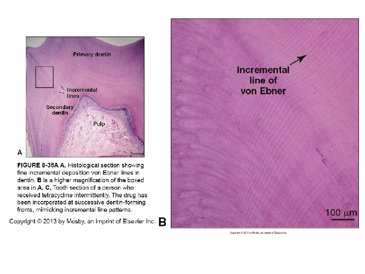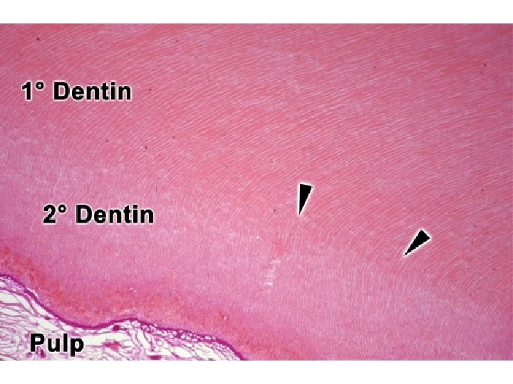 Incremental growth lines • Organic matrix deposited as a rate of 4μm per day • Changes in the orientation from day to day • At the 5 th day there is more exaggerated change in orientation (Lines of von Ebner) - ~ 20 μm apart. • At right angle to tubules and generally mark the rhythmic, linear pattern of dentin deposition in an inward and rootward direction • Rate of mineralization is 2μm every 12 hours. So the organic matrix of dentin is deposited rhythmically at a daily rate of about 4 μm/day and is mineralized in a 12 -hour cycle