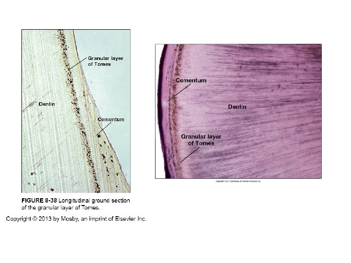 Granular layer of Tomes • Root • Ground sections • Progressive increase from the CE junction to the apex of the tooth • ? Hypomineralization of interglobular dentin – Initial theory • Sections made through loops of dentinal tubules and an optical phenomenon • Special arrangement of collagen and noncollagen matrix proteins at the interface between dentin and cementum