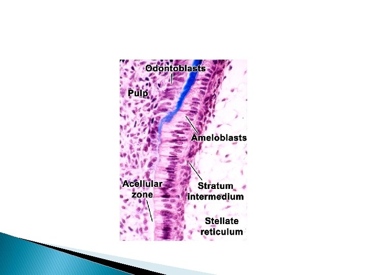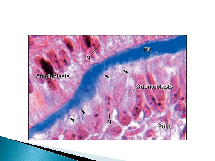 � These factors help in the organization of odontoblast cytoskeleton assembly, which is important for relocation of organelles that occurs prior to morphological changes. As the odontoblasts differentiate they change from an ovoid to a columnar shape, and their nuclei become basally oriented at this early stage of development.
