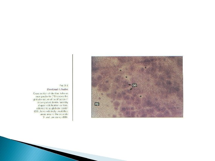 � Within the globular islands of mineralization, crystal deposition appears to take place radially from common centers, in a so-called spherulite form. These are seen as the first sites of calcification of dentin The general calcification process is gradual, but the peritubular region becomes highly mineralized at a very early stage. �