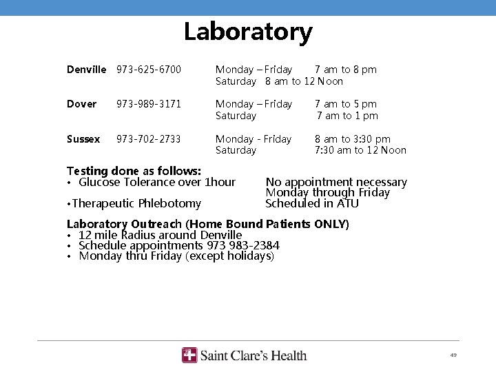 Laboratory Denville 973 -625 -6700 Monday – Friday 7 am to 8 pm Saturday 8 am to 12 Noon Dover 973 -989 -3171 Monday – Friday Saturday 7 am to 5 pm 7 am to 1 pm Sussex 973 -702 -2733 Monday - Friday Saturday 8 am to 3: 30 pm 7: 30 am to 12 Noon Testing done as follows: • Glucose Tolerance over 1 hour • Therapeutic Phlebotomy No appointment necessary Monday through Friday Scheduled in ATU Laboratory Outreach (Home Bound Patients ONLY) • 12 mile Radius around Denville • Schedule appointments 973 983 -2384 • Monday thru Friday (except holidays) 49