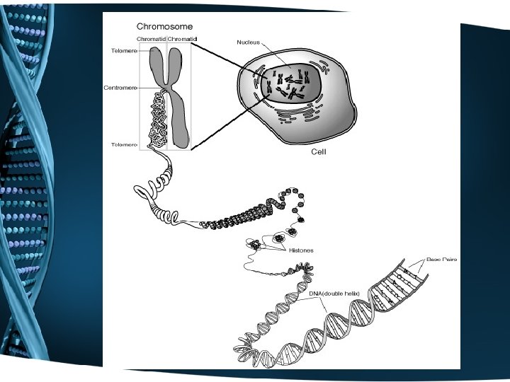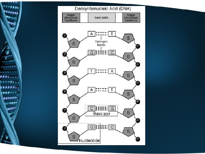 DNA Structure Cont • Adenine, Guanine, Thymine and Cytosine • A-T C-G • DNA consists of 2 strands of nucleotides, running in opposite directions. • The bases on each strand are complimentary , i. e. match up