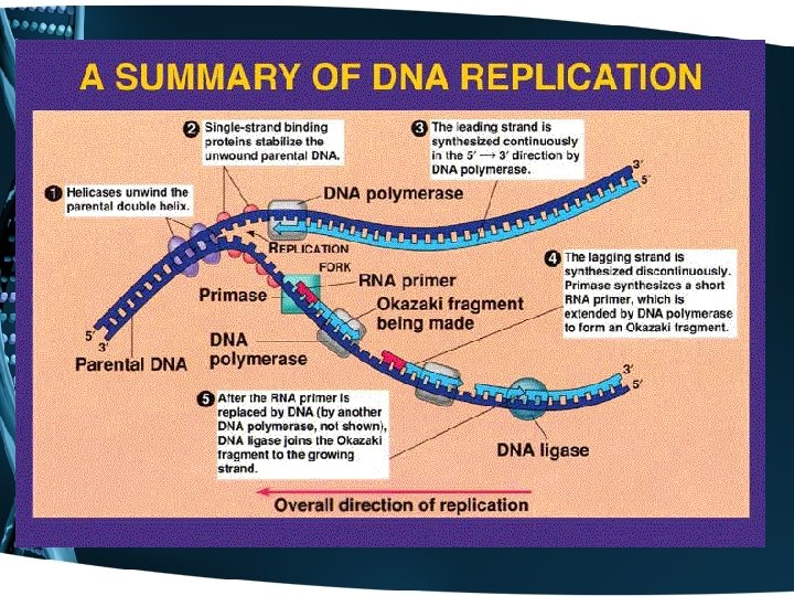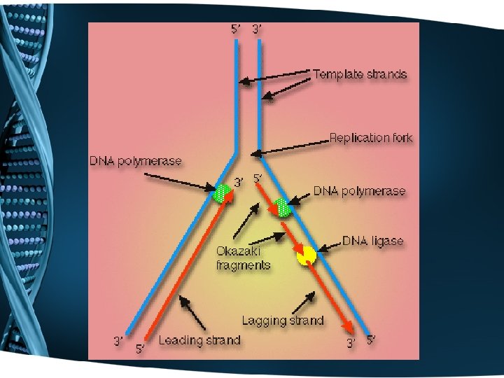 Okazaki Fragments • The sides of the DNA molecule are antiparallel. • DNA polymerase can only join new nucleotides to the 3’ end – the leading strand. • On the lagging strand small sections of complimentary DNA called Okazaki fragments are synthesized and assembled by DNA polymerase.