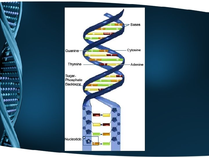 DNA Structure Cont • The two strands of DNA are coiled to form a double helix (like a twisted ladder) • The Double helix backbone is made of the sugars and phosphate groups. • The rungs on the “ladder” are made by the bases.