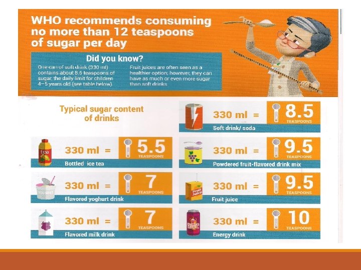 IV. Procedures A. Strategies to Implement Recommended Table Sugar in Teaspoons per Age Group per Day Age Recommend ed Energy Intakes per Day (in kcal) 10% Energy (in kcal) Equivalent Table Sugar per Day in grams in teaspoons Recommended Table Sugar per Meal in grams in teaspoons 6 -9 1600 160 40 8 13 3 10 -12 2060 206 51. 5 10 17 3 13 -15 2700 270 67. 5 13. 5 22. 5 4 16 -18 3010 301 75 15 25 4 19 -29 2530 253 63 12. 5 21 4 30 -49 2420 242 60. 5 12 20 4 50 -59 2420 242 60. 5 12 20 4 60 -69 2140 210 52. 5 10. 5 18 3