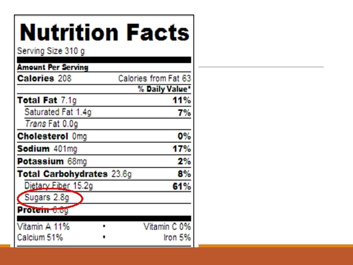 IV. Procedures A. Strategies to Implement 1. Food Standards g. Reading Nutrition Facts Most food products have Nutrition Facts on their labels which provide information about the nutrition content of a food or drink as prescribed by the Department of Health Administrative Order No. 20140030. The nutrition facts are presented in a tabular form declaring the amounts of protein, carbohydrates (dietary fiber and sugar), fat (saturated fat, trans fat, and cholesterol), sodium, and energy or calories.
