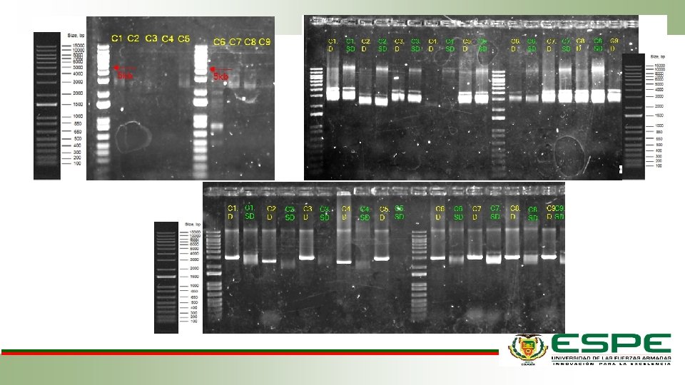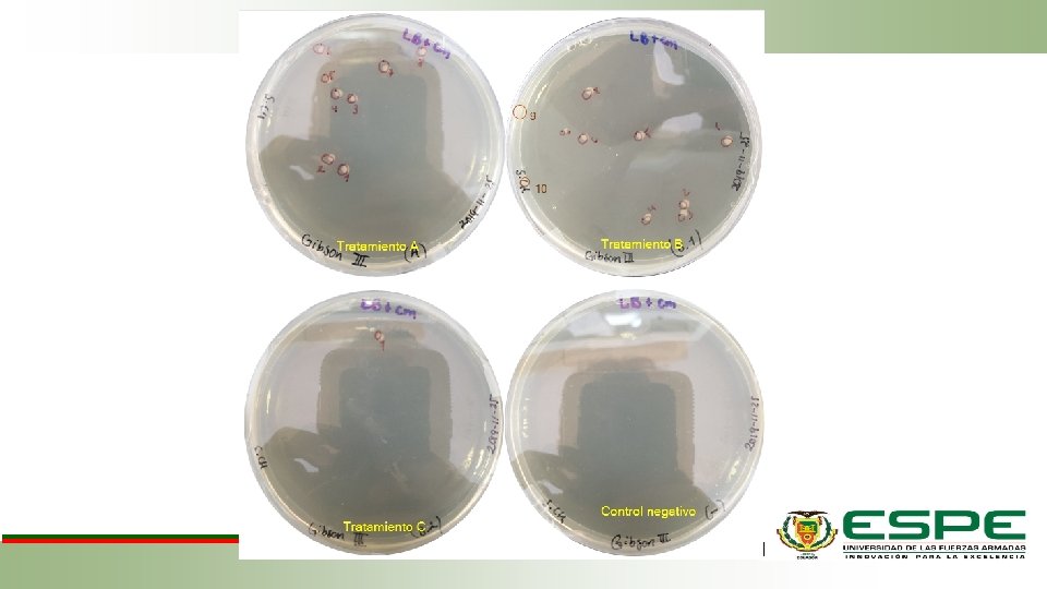 Estandarización de las reacciones Gibson T amb. 45 min Primer ensayo -2µl de Buffer de reacción 5 X -1µl de Mix de enzima 10 X -140 ng de cada fragmento de PCR (6. 11 µl) -0. 89 µl de Agua ultra pura Escherichia coli DH 10 B T= 50°C 45 min Segundo ensayo -2µl de Buffer de reacción 5 X -1µl de Mix de enzima 10 X -200 ng de cada fragmento de PCR (4. 48 µl) -2. 52 µl de Agua ultra pura Escherichia coli DH 10 B
