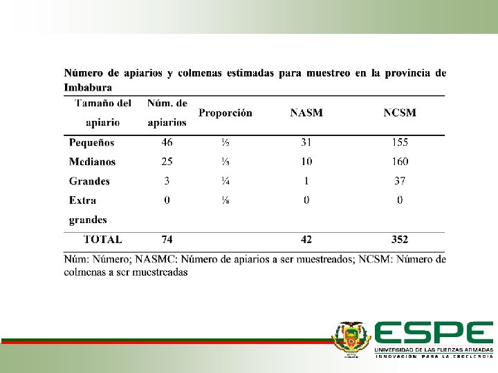 CÁLCULO DEL TAMAÑO DE LA MUESTRA (APIARIOS) Cálculo del tamaño de la muestra Provincia Número de apiarios Tamaño de muestra Pichincha 108 51 Imbabura 74 42 Carchi 40 28
