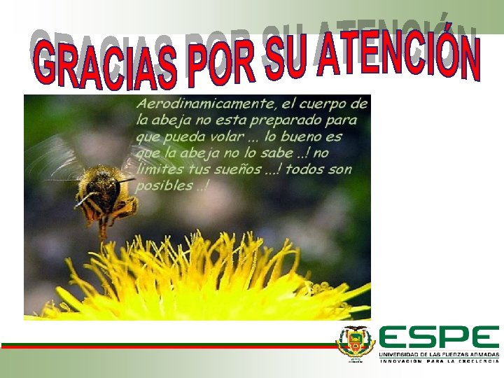 RECOMENDACIONES • Se debe mejorar el manejo que se da a las colmenas, esto evitará que las abejas desarrollen correctamente sus actividades vitales sin pasar largos periodos de tiempo en el interior de las colmenas ocasionando gran acumulación de heces las cuales podrían convertirse en fuentes de inóculo de las microsporidias. • Es importante cuidar el aspecto nutricional de las abejas para con ello mantenerlas fisiológica e inmulógicamente listas para enfrentar posibles brotes de enfermedades. • Es necesario extender el muestreo de los apiarios a nivel nacional, ya que factores como la trashumancia pueden extender la frontera de expansión de parásitos y patógenos que afectan a las abejas. • Es fundamental el promover la investigación de temas como el propuesto en este trabajo, ya que no se dispone de la información necesaria para establecer y desarrollar campañas de capacitación que permitan conocer a los apicultores las implicaciones que con llevan el manejar inadecuadamente sus colmenas.
