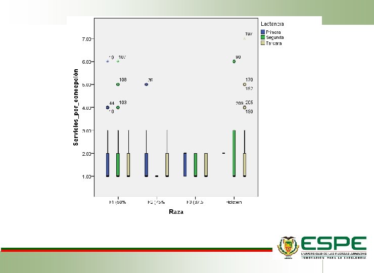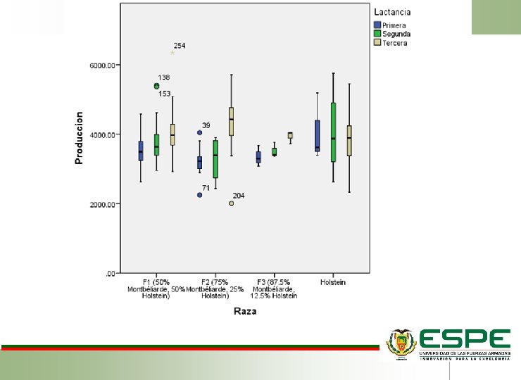 Análisis producción por lactancia ajustada • Los datos fueron condensados en función al número de registros obtenidos, de esta manera se realizaron los análisis correspondientes por lactancia, agrupando las lactancias a partir de la tercera, debido al número limitado de datos disponibles en esas categorías.