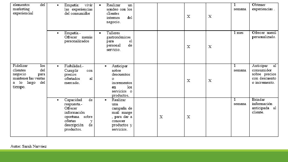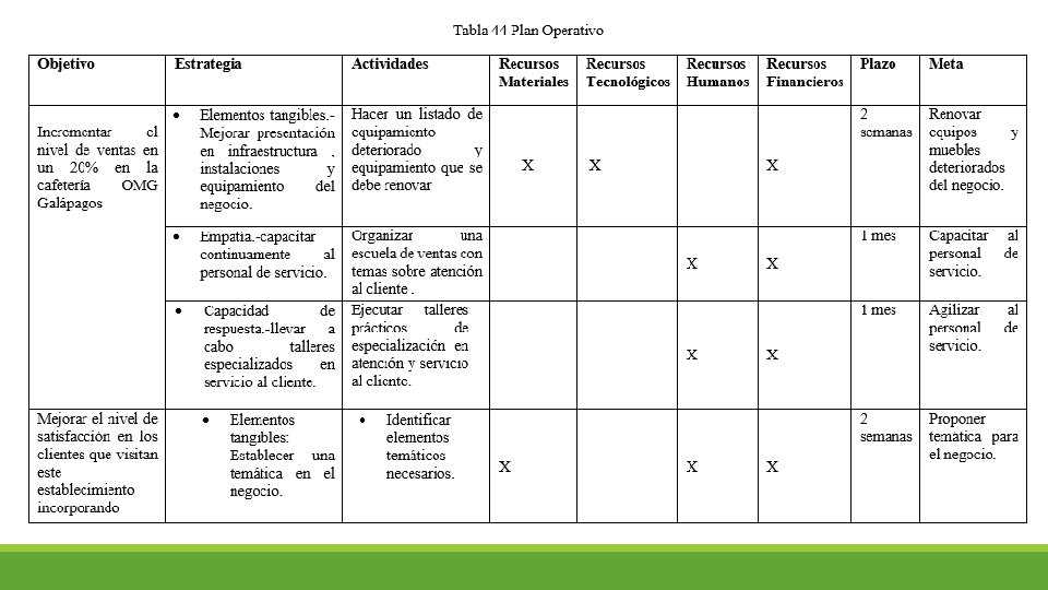 Propuesta-Modelo de Servicio Objetiv os Plan Operativo: 20% nivel de ventas • • • Incorporar elementos de marketing experiencial Estrategias Actividades Recursos Plazo determinado Metas Fidelizar clientes para mantener niveles de ventas.